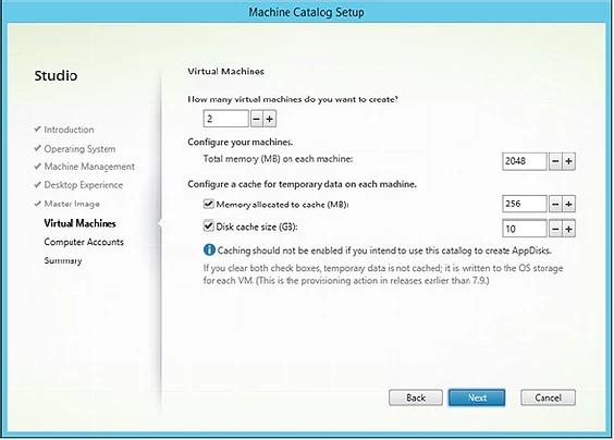 The configuration of the temporary memory based and disk-based cache is built into the definition of the machine catalog. It is possible to define a catalog with temporary memory and Disk cache, or with no temporary memory cache or one with no disk cache. As with PVS, the approach selected must make sure that the cache is large enough to contain all writes.